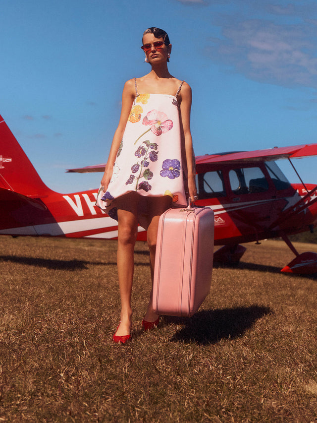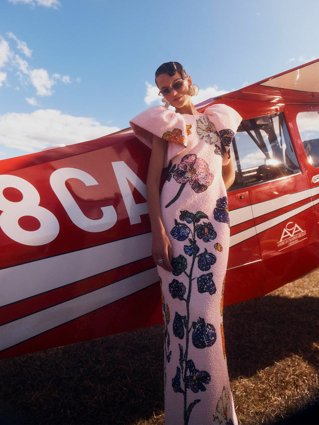 A playful scattering of detailed wildflowers in vibrant purple, orange, and white bloom across a delicate pink base. Sparkling, intricate, and bursting with whimsical charm.