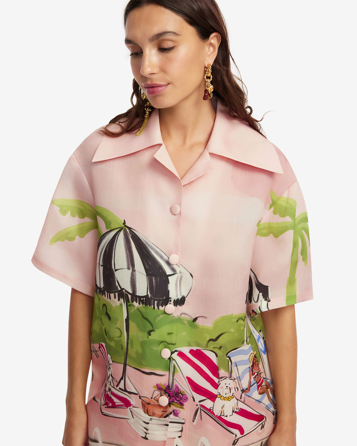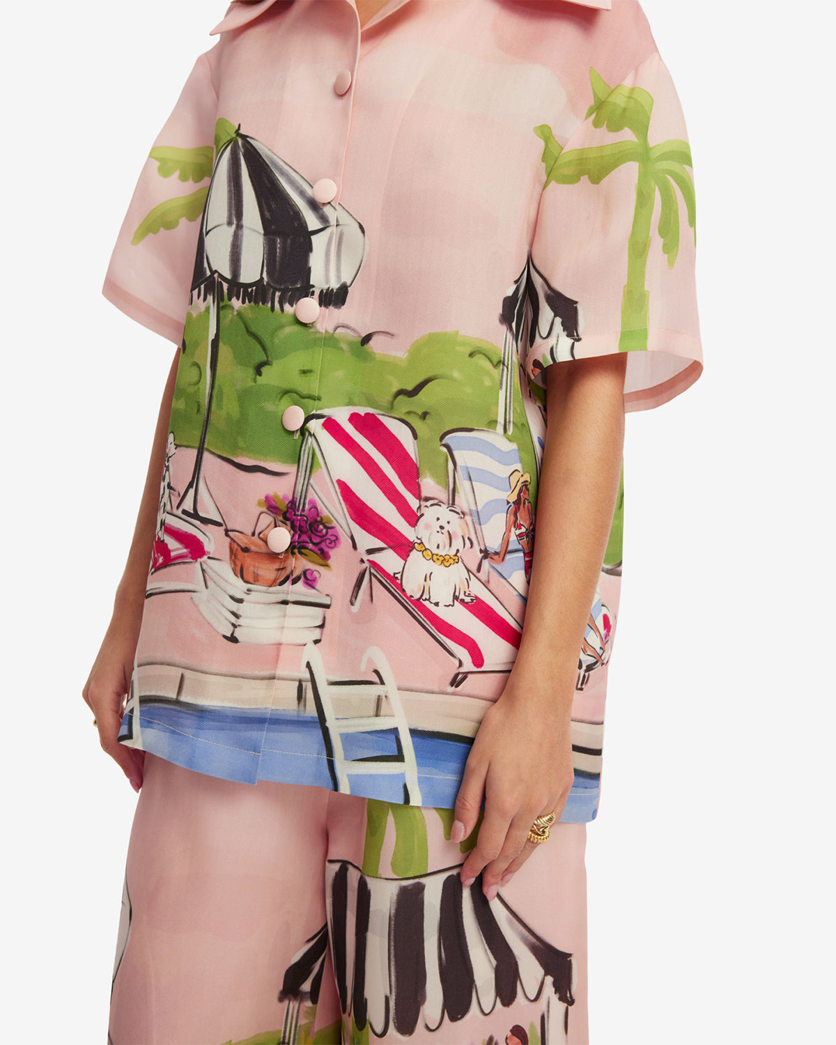 This charming, hand-sketched resort scene is a dreamy European holiday in fabric form. Complete with poolside glamour and playful accents, this print is bright, nostalgic, and fun. Say bonjour to summer!