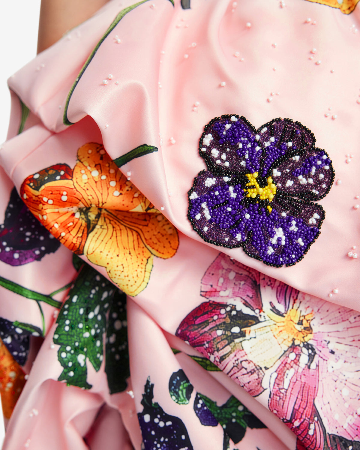 A playful scattering of detailed wildflowers in vibrant purple, orange, and white bloom across a delicate pink base. Sparkling, intricate, and bursting with whimsical charm.