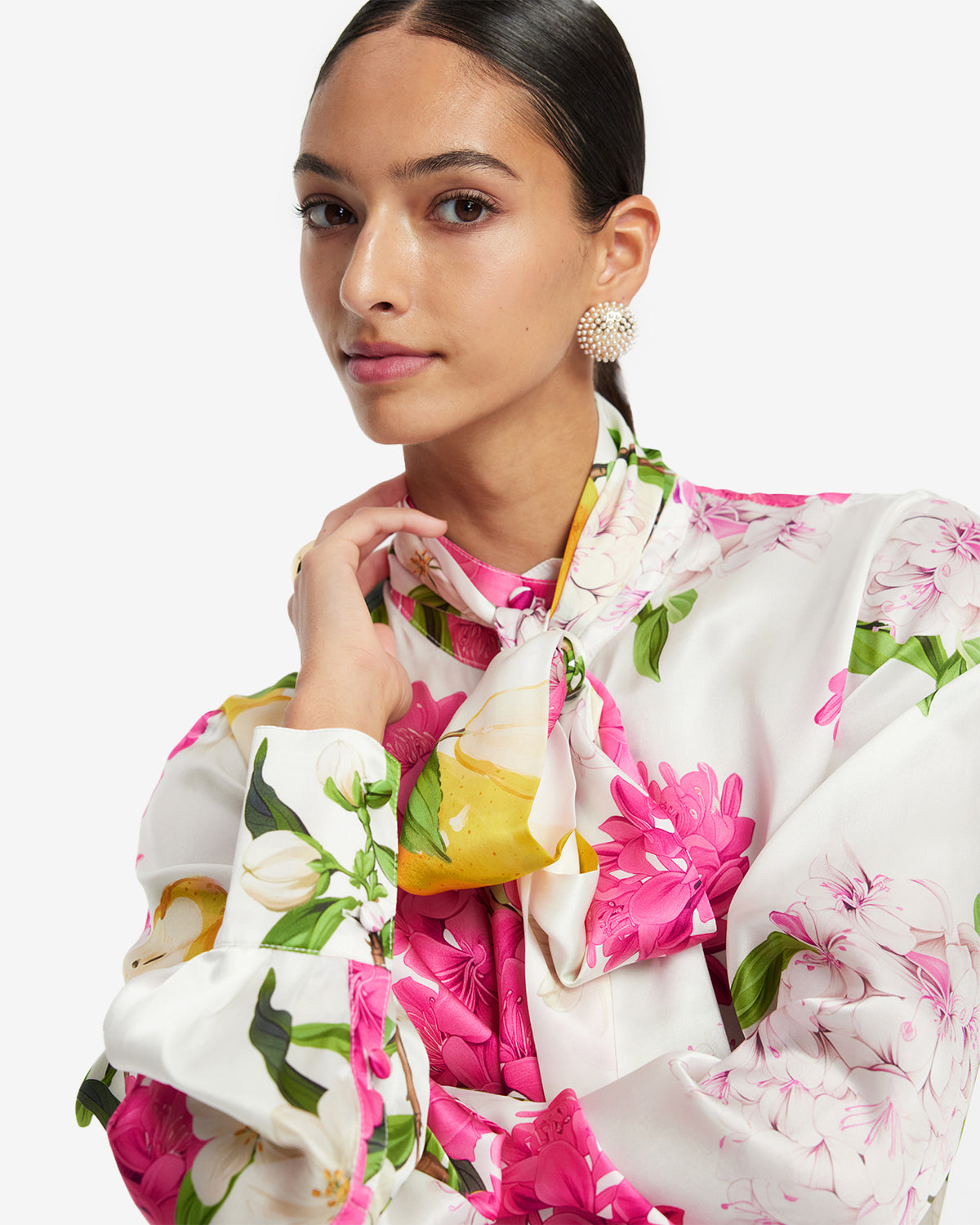 - Premium silk tie neck blouse