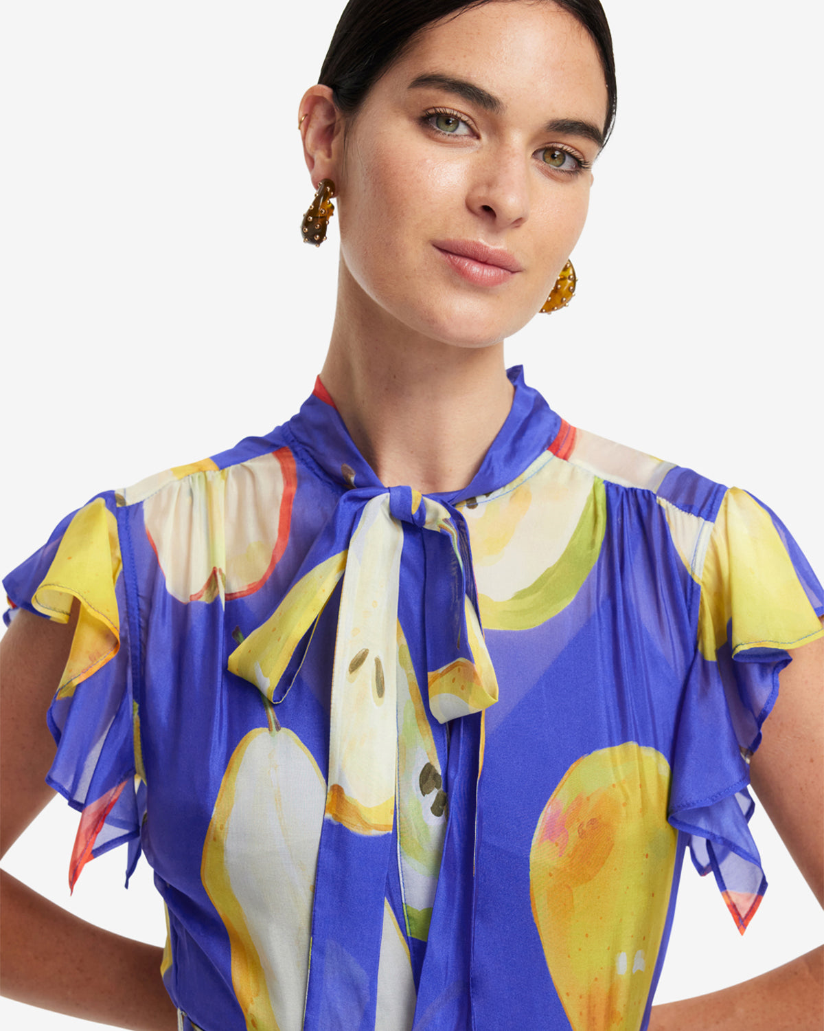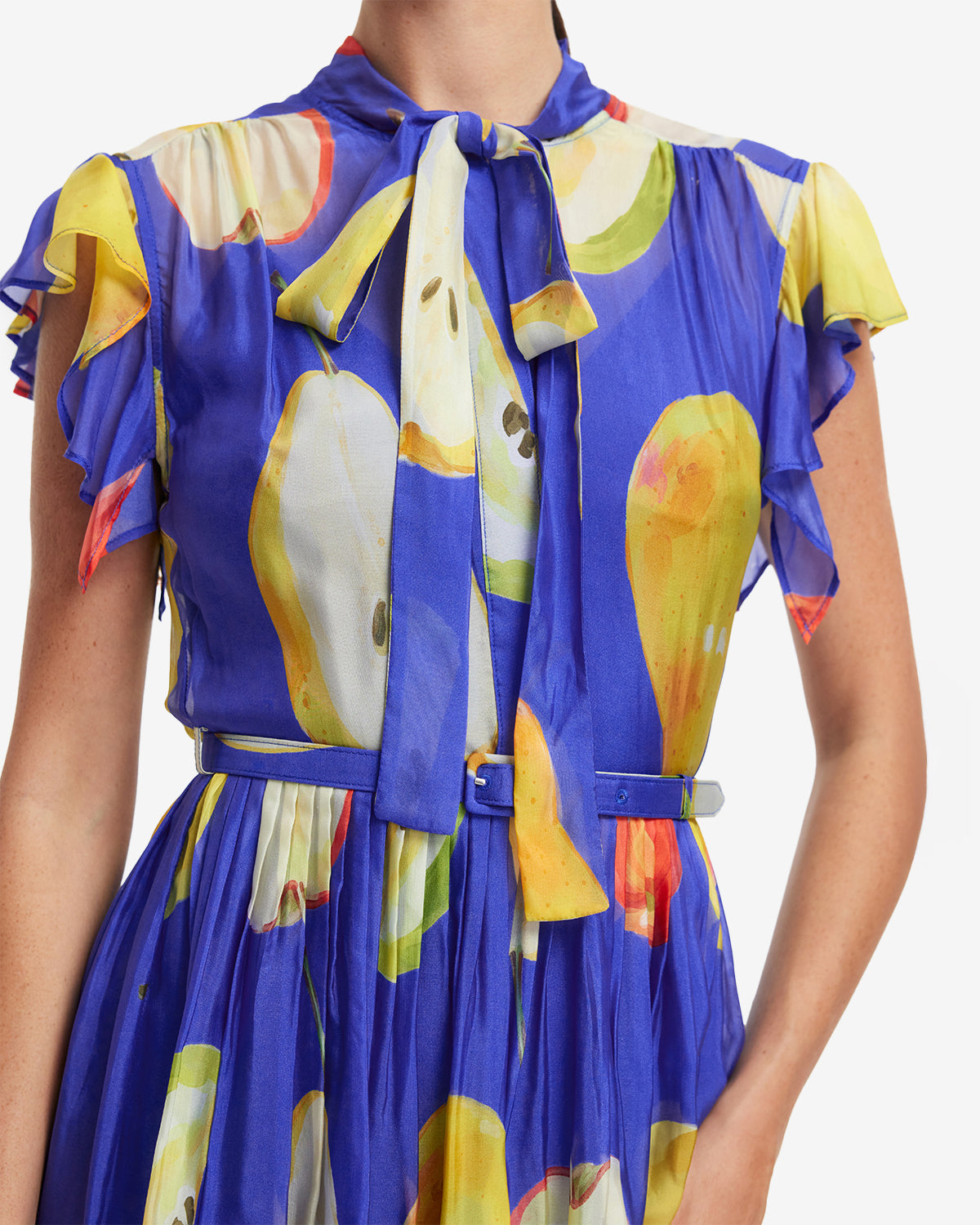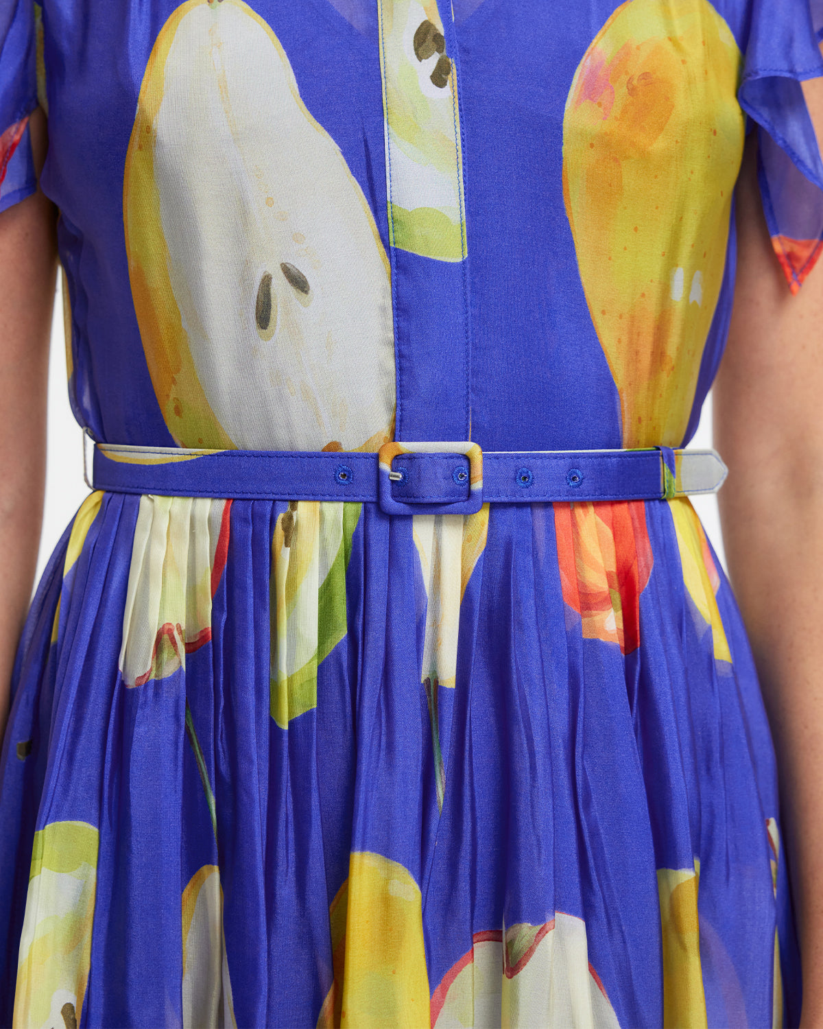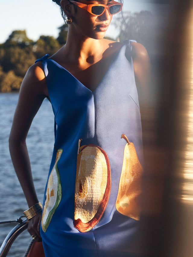 An ode to the orchard. Lush pears are playfully scattered across a striking cobalt base, painterly and ripe with fun.