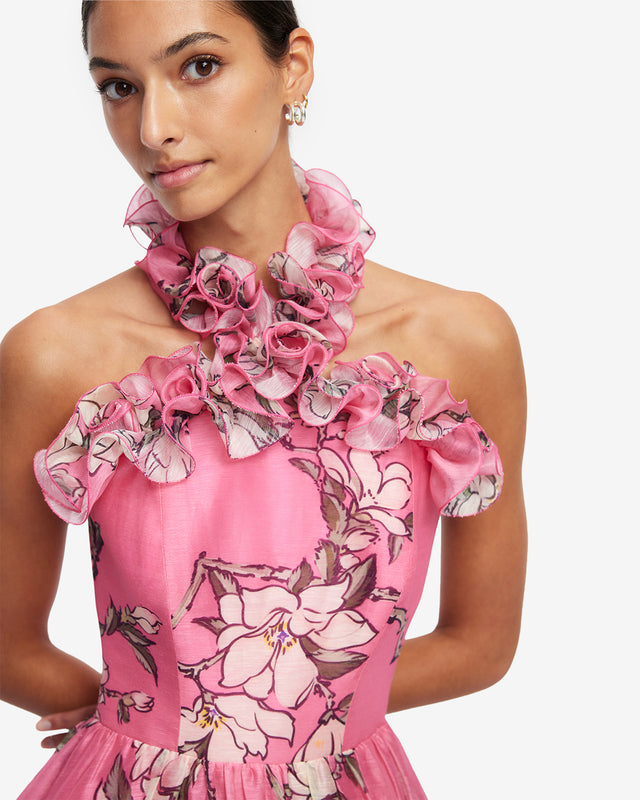 - Handcrafted ruffled halterneck