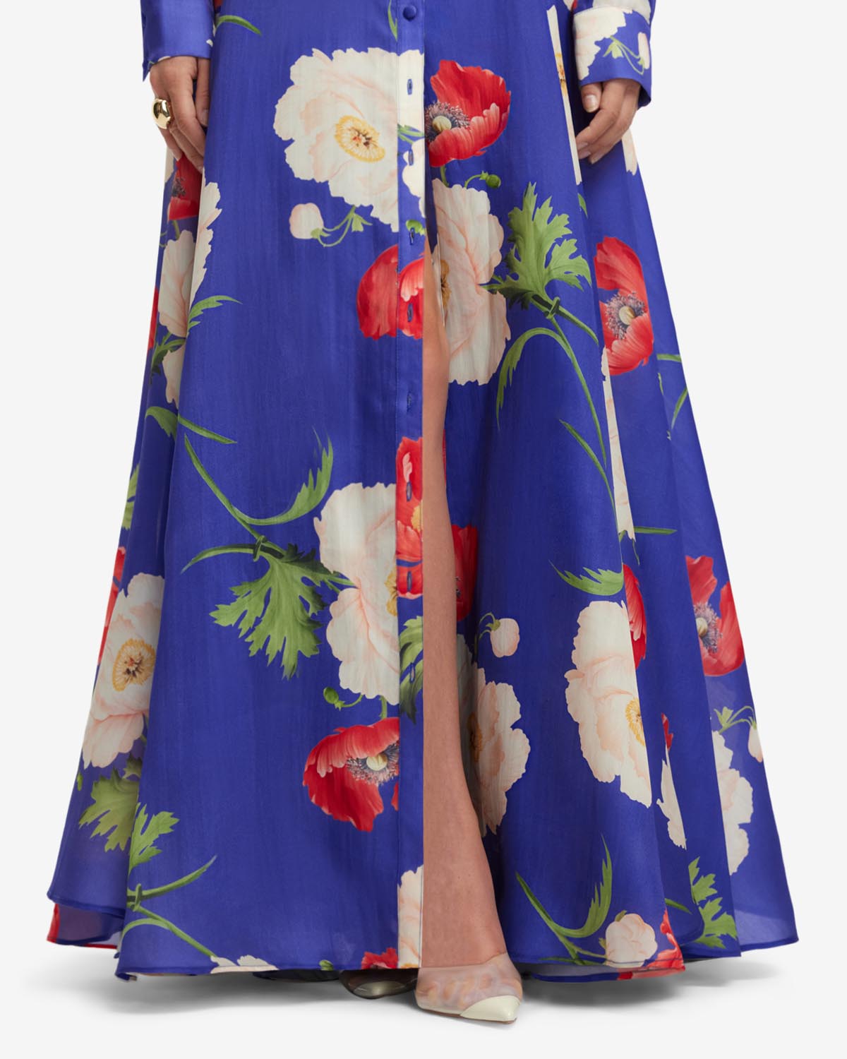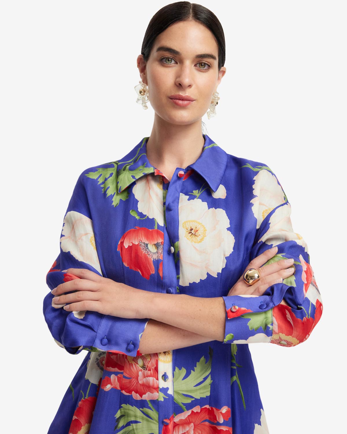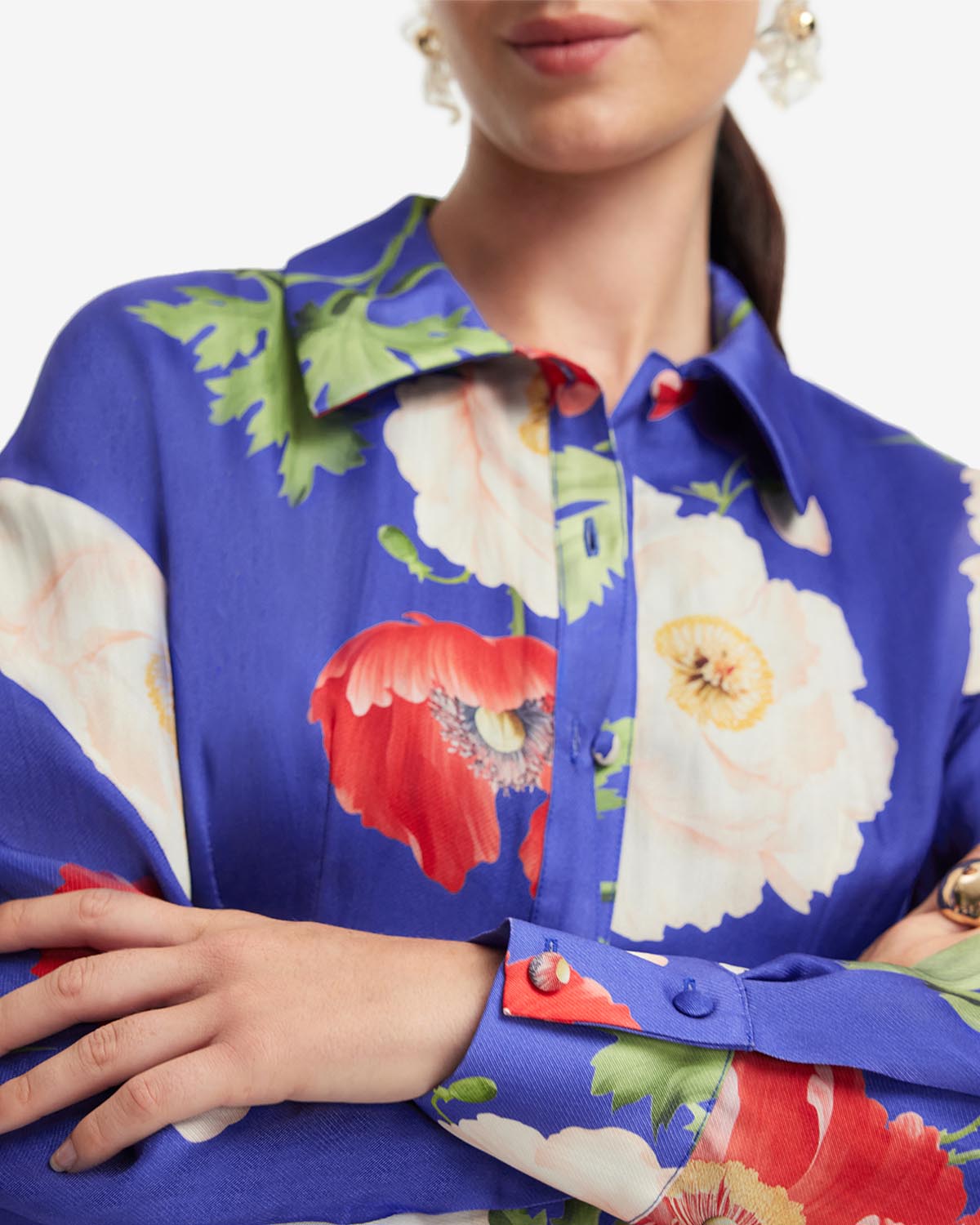 Vivid red and cream poppies pop against a rich lapis blue, with inky centres and soft, sketched stems. It’s bold, dreamy, and made to stand out.