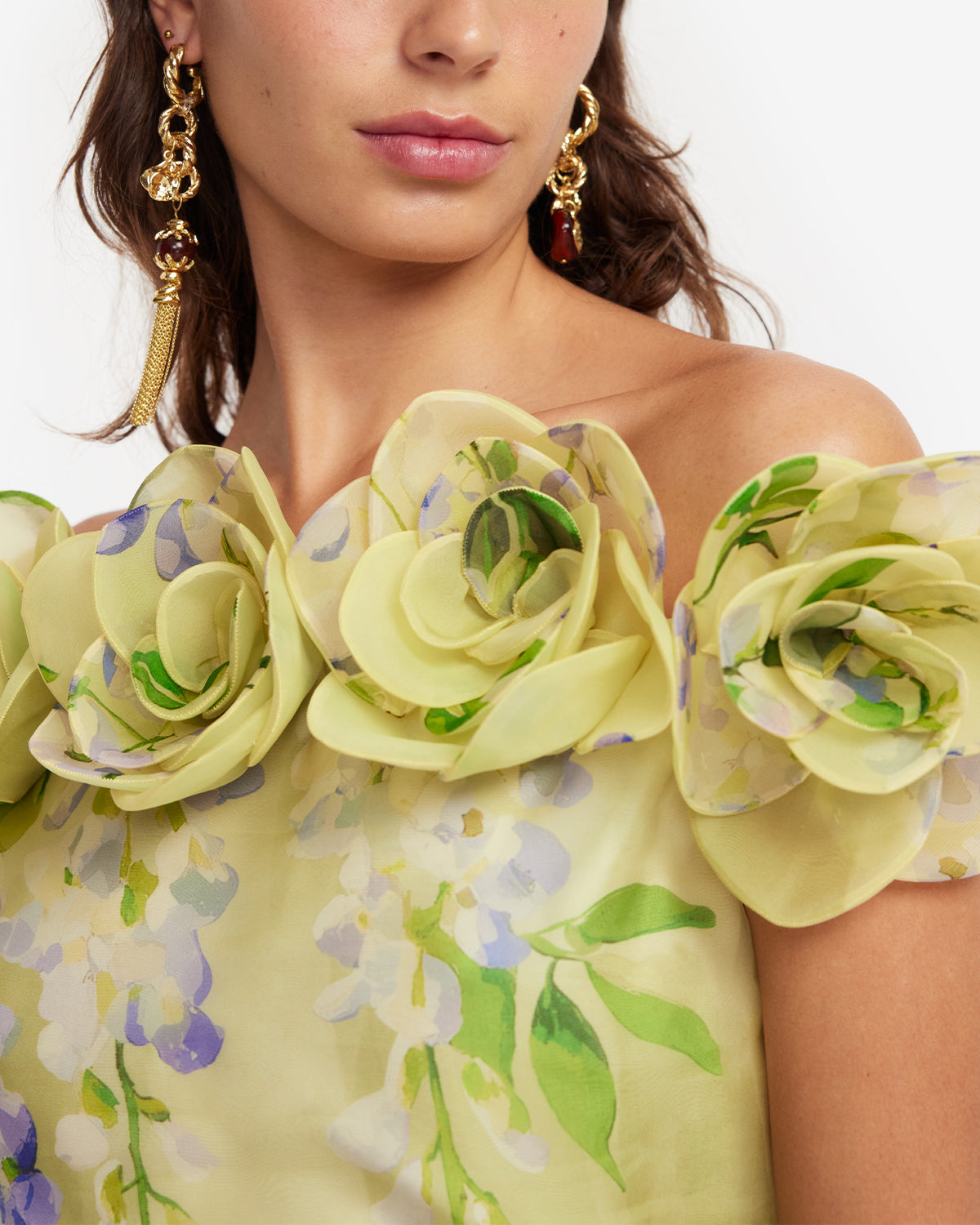 A cascading lilac dream! These beautiful lilac wisteria blooms tumble down a soft lime canvas. This print evokes pure fresh air, and feels like floating through a tranquil, sun-drenched garden on the first day of spring.