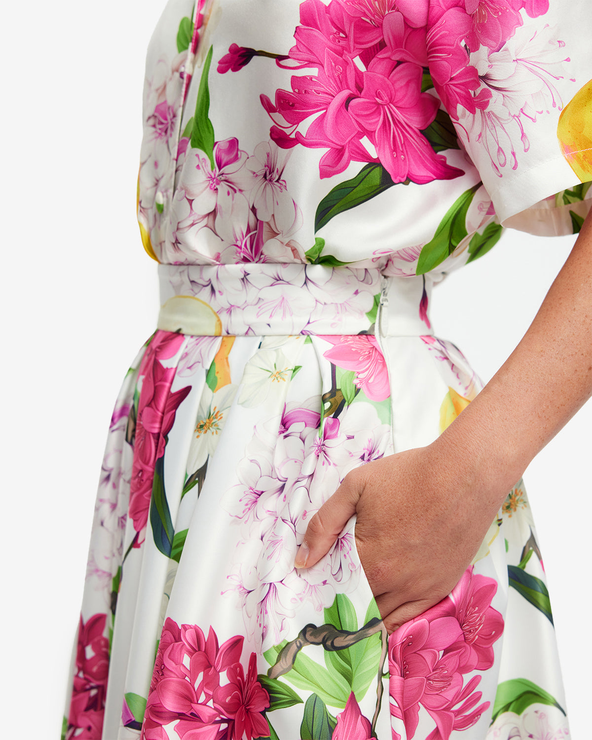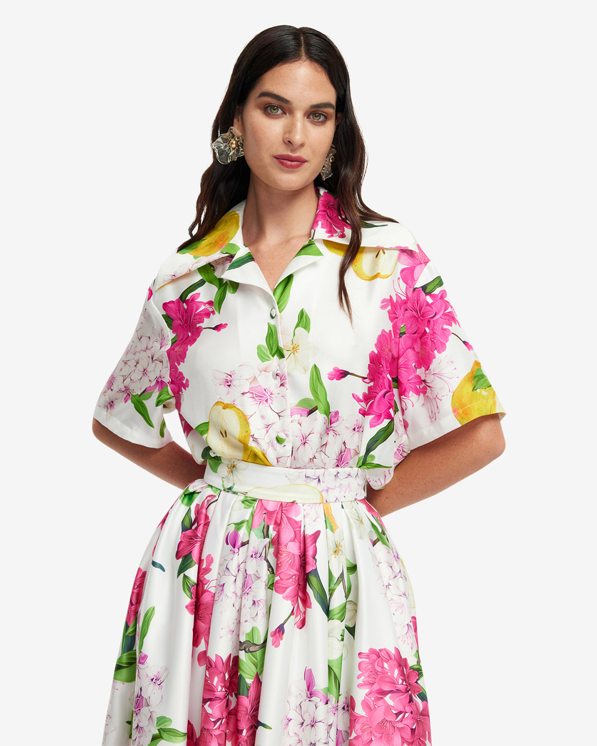 Blossoms and pears tangled together on a soft canvas. Fresh, whimsical, and just a little nostalgic — like orchard days in bloom.