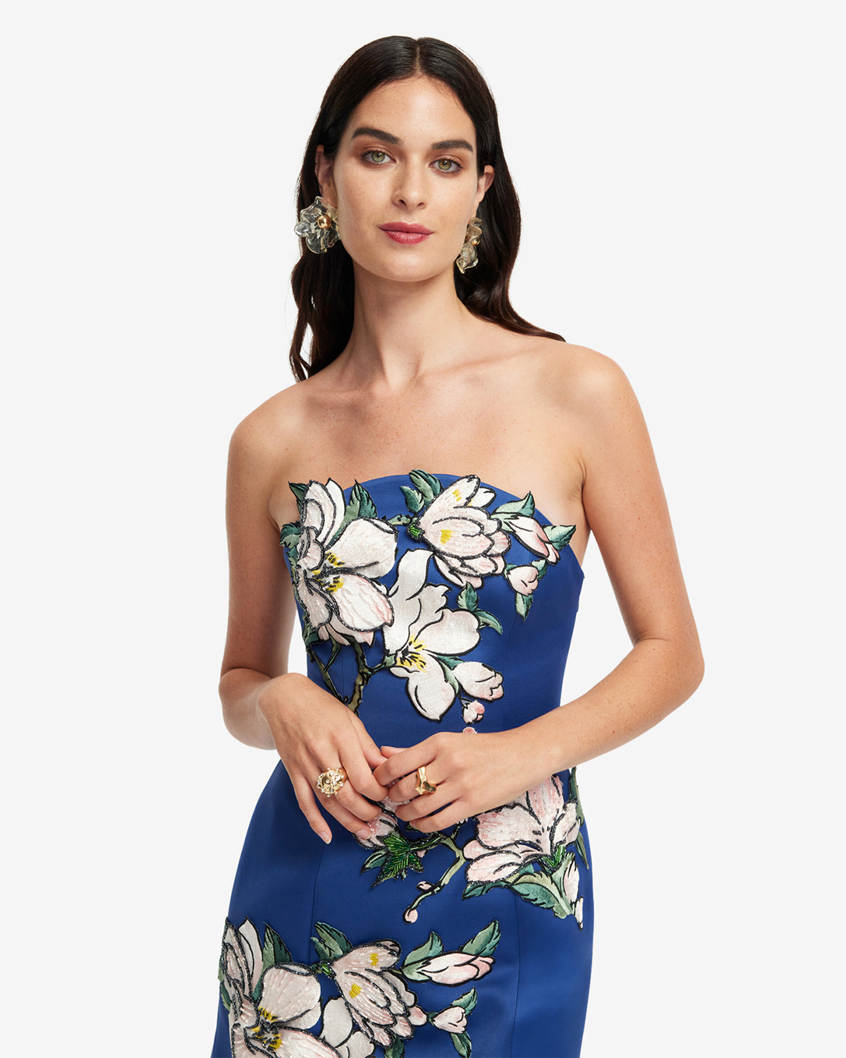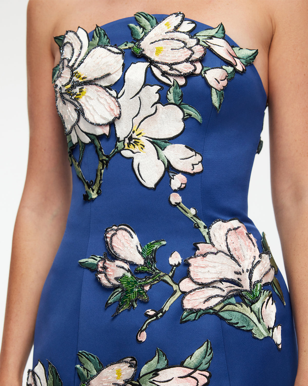 Cream and blush magnolias glow against a deep midnight ground. Bold, moody, and a little dreamy — like flowers caught under moonlight.
